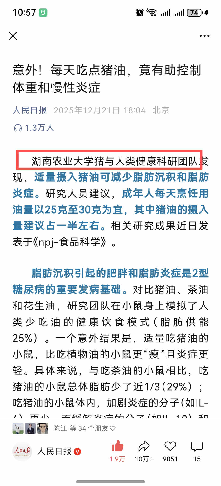 官媒齐发声!文利新教授团队为猪油正名研究冲上热搜