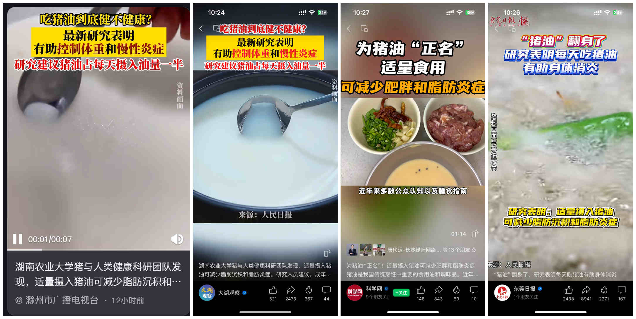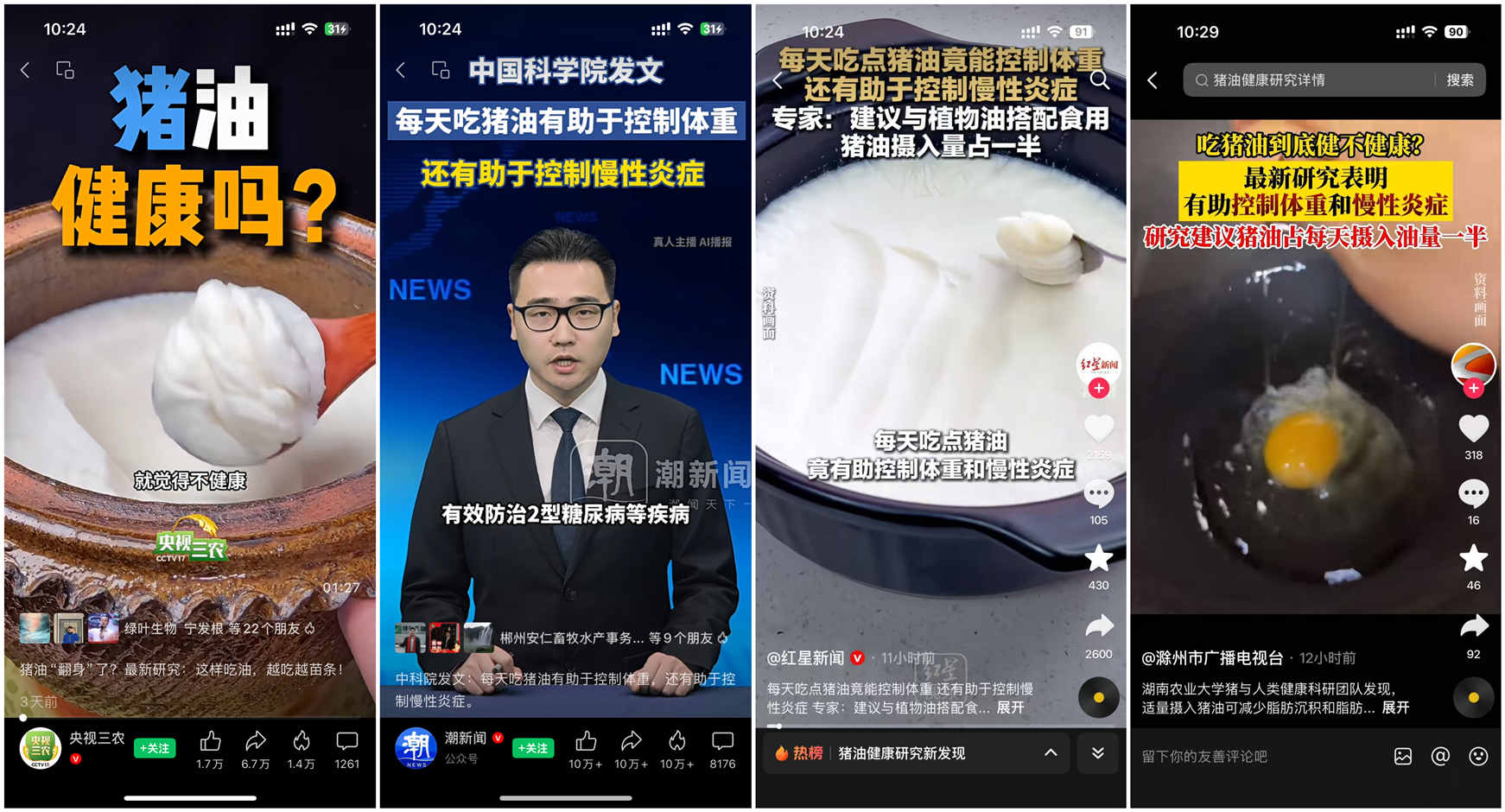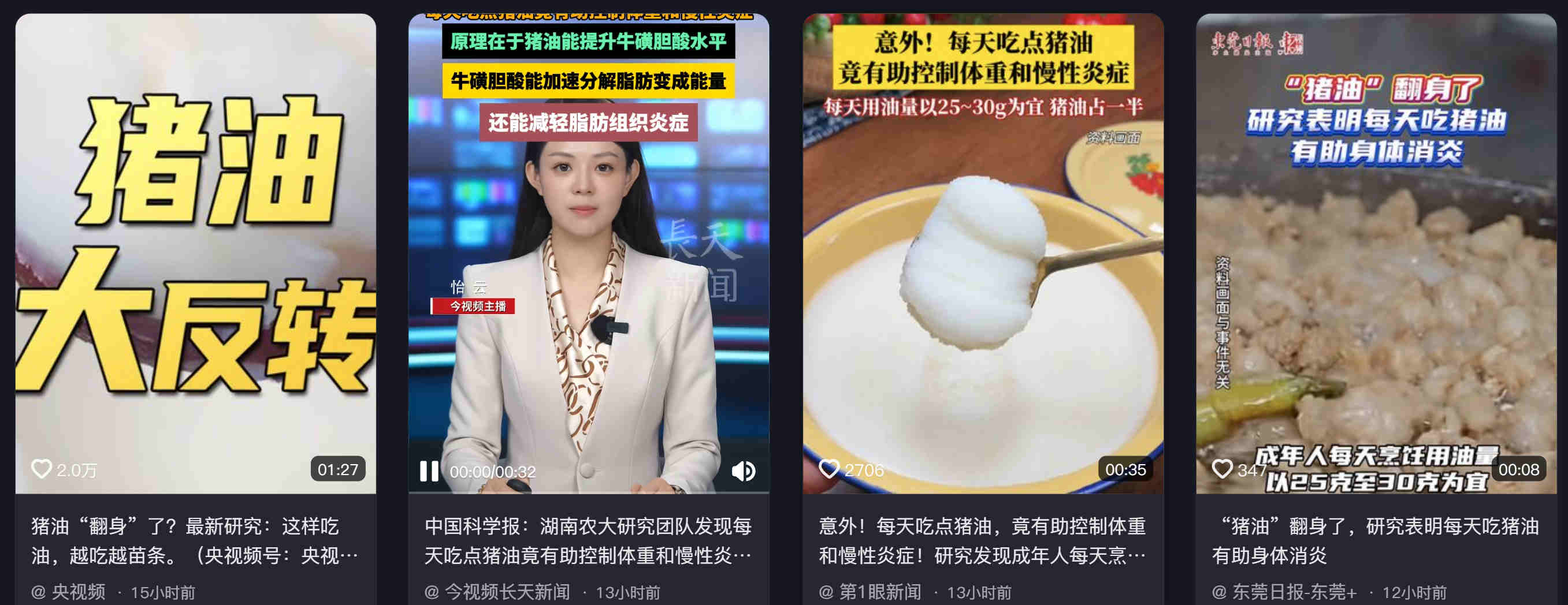 在抖音、快手、视频号等社交平台上,人民日报、新华网、人民网、新华社、环球网、中国科学网、科学网、中华网、中国妇女网9家中央级媒体,央视频、央视三农、红星新闻等官方视频账号,以及多地媒体,几十家权威机构纷纷转发报道,将猪油这一传统食用油重新推入公众视野的中心。