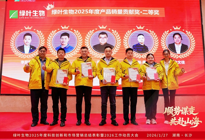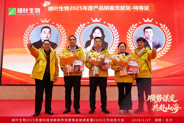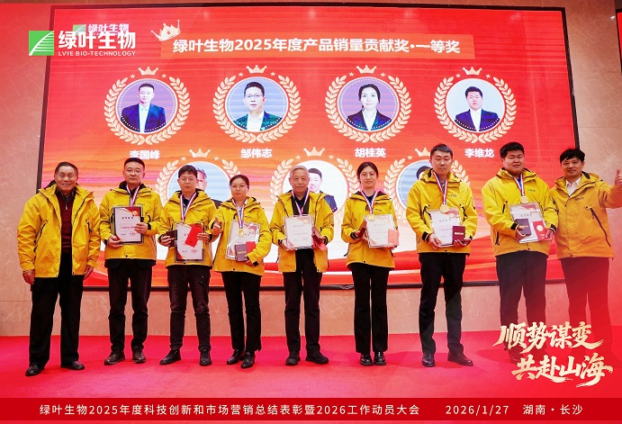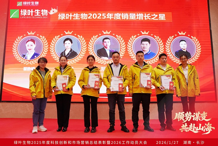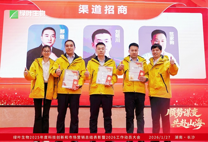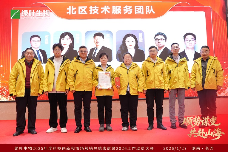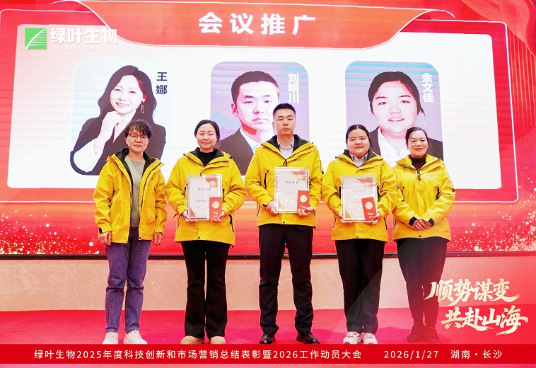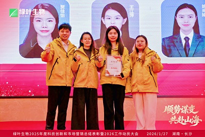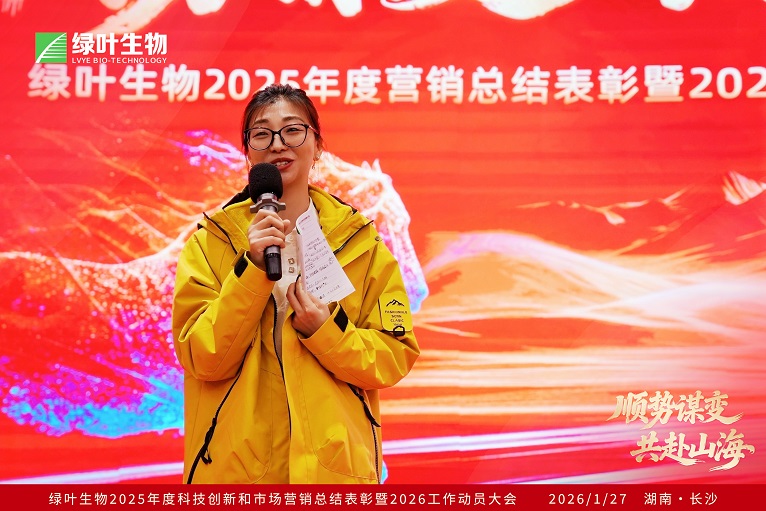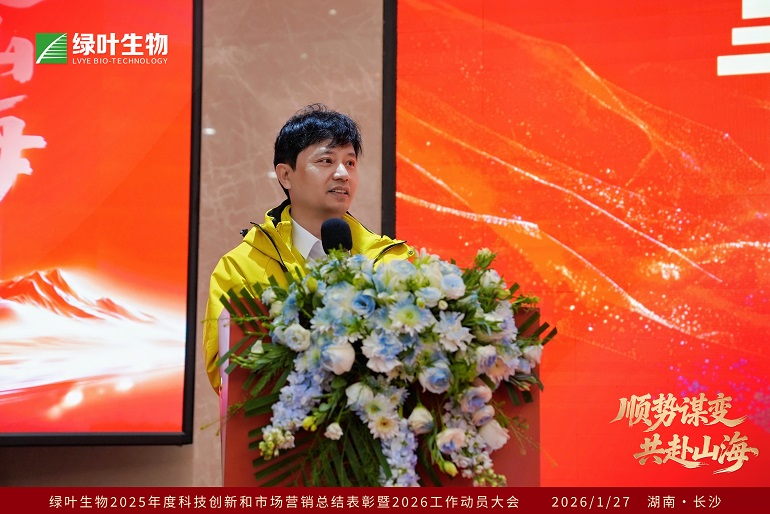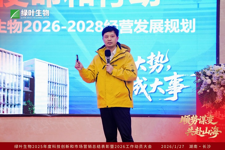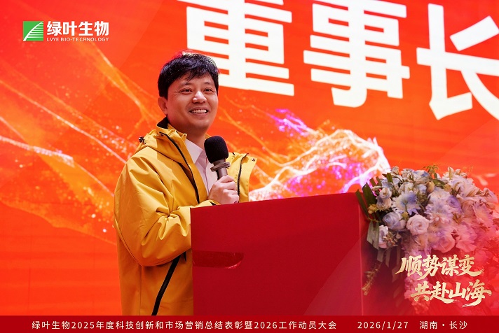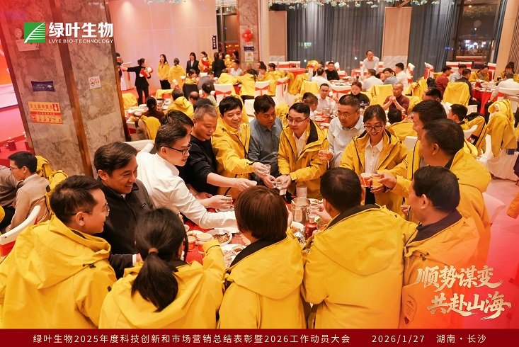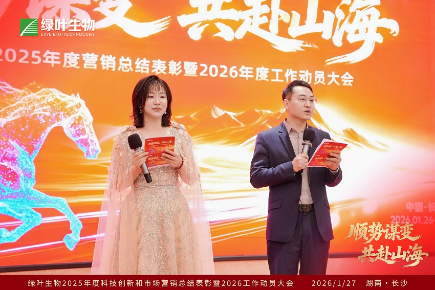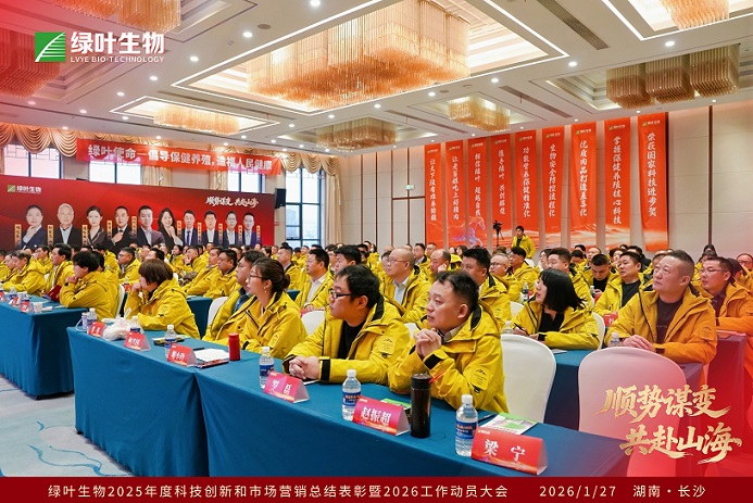 2026年1月27日,长沙绿叶生物科技有限公司以“顺势谋变 共赴山海"为主题,在湖南长沙华良华天假日酒店隆重召开2025年度科技创新和市场营销总结表彰暨2026工作动员大会。